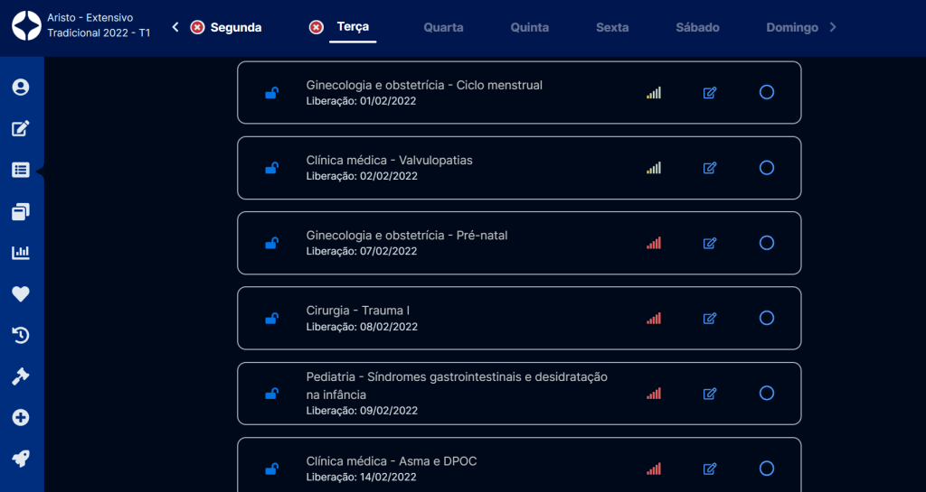 Através da nossa plataforma você recebe, de maneira automática, um planejamento semanal de estudos com metas específicas, uma programação de revisão repetida e espaçada, estudo prático com questões e flashcards, personalização de estudo e revisão através de Inteligência Artificial dentre vários outros recursos.