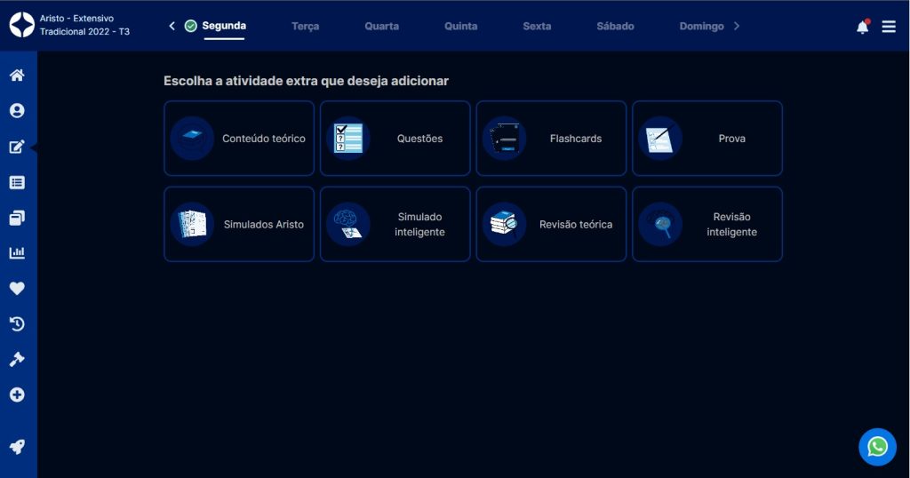 Através da nossa plataforma você recebe, de maneira automática, um planejamento semanal de estudos com metas específicas, uma programação de revisão repetida e espaçada, estudo prático com questões, flashcards, revisão através de Inteligência Artificial e muito mais.