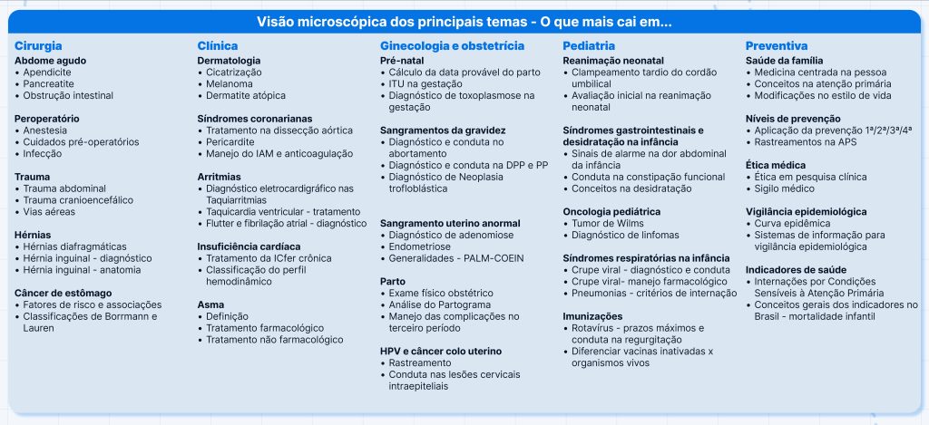 Os conteúdos mais explorados incluem antibioticoprofilaxia em cirurgias, câncer gástrico, prevenção (tipos de prevenção e exames), sinais de semiologia e identificação de ECG – especialmente taquiarritmias. Na preventiva, o enfoque no SUS e seu funcionamento é notável. Vale a pena investir em questões sobre ética médica, também.