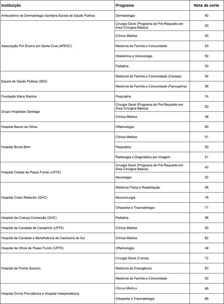 Confira abaixo as notas que os últimos candidatos convocados tiraram na prova da AMRIGS. Os dados foram divulgados pela própria AMRIGS no último processo seletivo, com acesso em 2021: