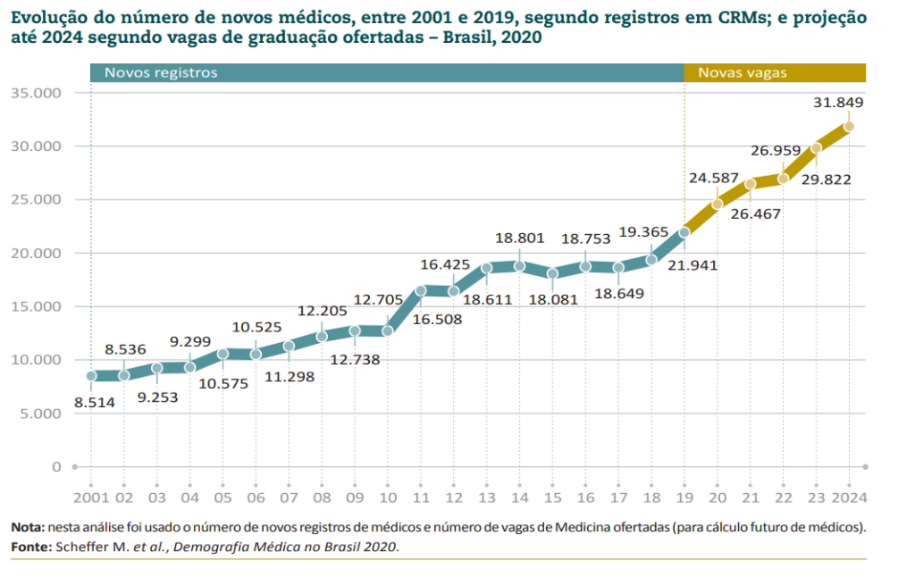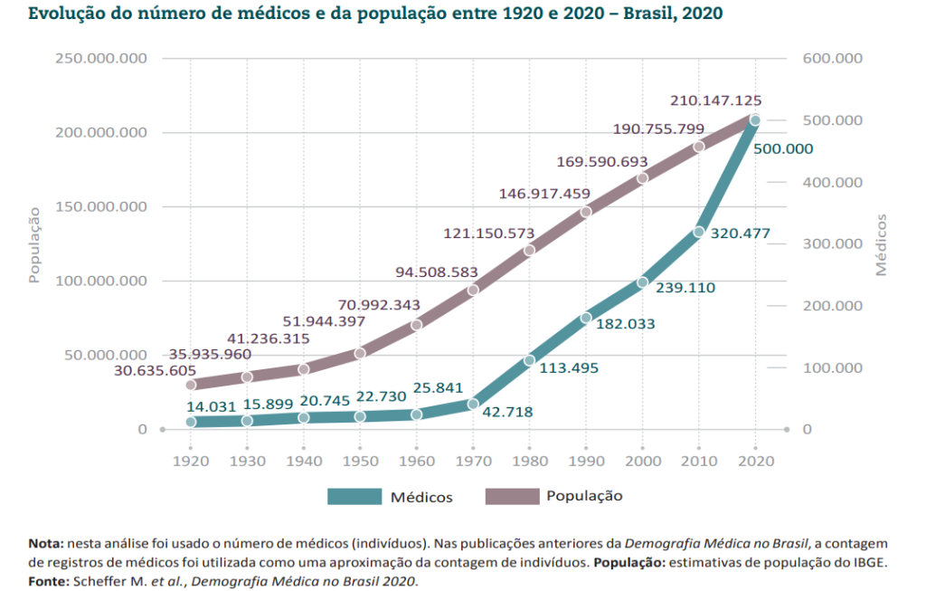 Nos últimos 100 anos, segundo pesquisa sobre a demografia médica no Brasil em 2020, o número de médicos no Brasil aumentou proporcionalmente cinco vezes mais que o número de habitantes.