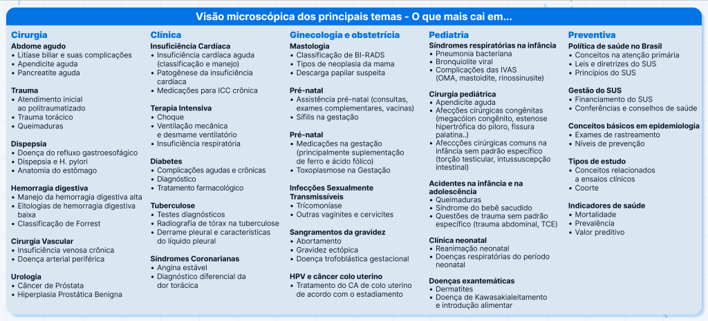 Acompanhe no quadro abaixo detalhes da incidência de temas nas provas de residência médica da AMP, em níveis macro e micro: