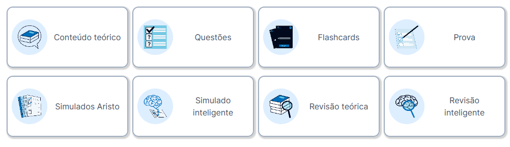 Ao entrar na tela inicial da plataforma, o aluno da Aristo já tem acesso aos principais métodos de estudo que utilizamos.