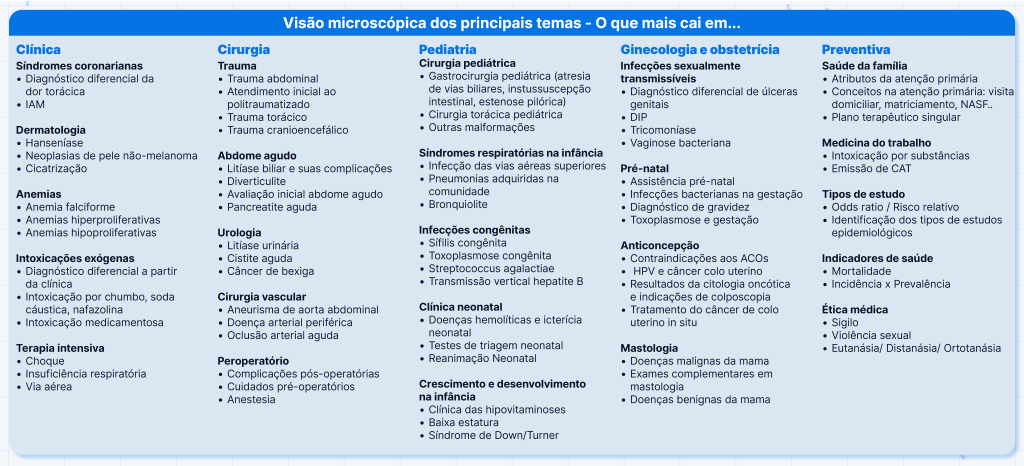 Acompanhe no quadro abaixo detalhes da incidência de temas nas provas de residência médica da UNICAMP, em níveis macro e micro: