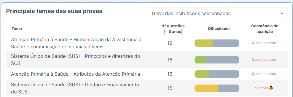 A aparição do tema Gestão e financiamento do SUS é bastante comum nas provas com uma quantidade média de 15 questões nos últimos 5 anos, como você pode ver nos gráficos abaixo: