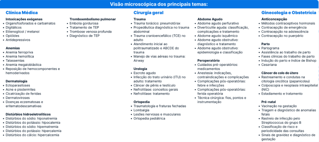 Áreas básicas de Cirurgia Geral, Clínica Médica, Medicina Preventiva e Social, Obstetrícia e Ginecologia, e Pediatria.